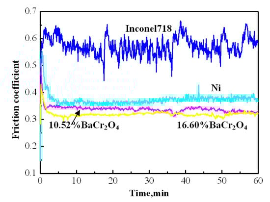 Nickel-chromium matrix composites incorporated with different amounts of BaMoO4 were hot-pressed to evaluate the tribological properties using a ball-on-disc tribometer up to 600 °C. It is noted that the NiCr-20 wt.% BaMoO4 composite possesses the best tribological performance, with a lower friction coefficient and almost an order of magnitude lower wear rate than the unmodified Ni-Cr composite at 600 °C, which is closely related to the lubricity of a smooth and dense oxide layer formed on worn surfaces, with strong Raman peaks corresponding to BaMoO4 [118]. The self-lubricity of Ni3Al matrix composites in a temperature range of room temperature to 800 °C is attributed to the synergistic lubrication of Ag and BaCrO4 and BaMoO4 barium salts in sliding against coupled Si3N4 ball [124]. However, the formation of non-lubricious BaAl2O4 in the composite must be avoided during the fabrication process.