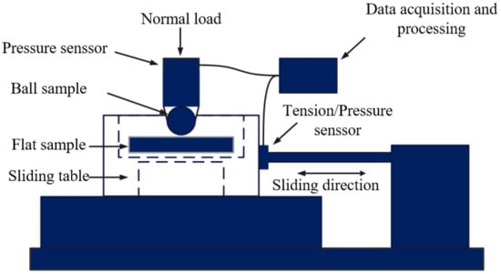 The CFT-I Material surface performance comprehensive tester (Lanzhou Institute of Chemical Physics, Chinese Academy of Sciences, Lanzhou, China) carried out the test due to the advantage of the ball-plane contact method, such as a good contact state and easy analysis of damage forms. The friction pair was a 45# steel ball with a radius is 6 mm (hardness: 197 HV). The force loaded on the coating surface through 45 gauge steel balls is 5 N, 10 N, and 15 N, respectively. The experimental time was 30 min, and the frequency was 1 Hz. The experiment was repeated three times for each condition. The test was conducted at room temperature, and the computer automatically recorded the friction coefficient data. Figure 2 is a schematic diagram of the structure of the reciprocating friction and wear testing machine