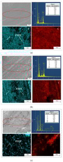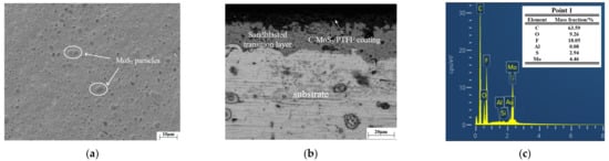 As illustrated in Figure 3c, the composition (atomic number fraction, %) of the elements on the surface of the C-MoS2-PTFE coating was 63.59C, 9.26O, 18.05F, 2.96S, 4.46Mo. From Figure 3a,d, the modified coating is mainly composed of PTFE and diffusely distributed MoS2 particles and C. These diffusely distributed MoS2 particles can significantly improve the anti-wear performance of PTFE [19]. Graphite was added to the PTFE coating to reduce the friction coefficient and improve the wear resistance of the coating [20]. The average microhardness of C-MoS2-PTFE coating was 35 HV0.1.