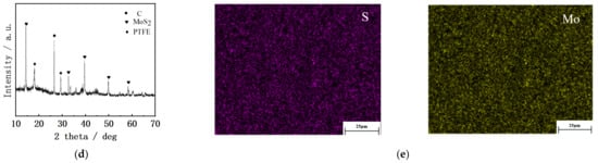 Figure 3 shows the morphology of the C-MoS2-PTFE coating surface, the cross-section morphology of the C-MoS2-PTFE coating, the XRD pattern of the C-MoS2-PTFE coating surface, and the EDS results of the C-MoS2-PTFE coating surface. According to Figure 3a,b and e, the distribution of each element is uniform, and the surface of the C-MoS2-PTFE coating is smooth, with good coverage and density. The coating was closely bonded to the matrix material, and cracks were not observed in the bonding area.