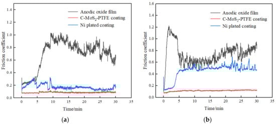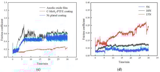 Figure 4a–c is the friction coefficients of C-MoS2-PTFE coating, 4032 aluminum alloy anodic oxide film, and Ni-plated coating. Figure 4d is the friction coefficients of modified PTFE coating under different loads. According to Figure 4, the friction coefficient curves under different loads can be roughly divided into the rising, falling, and steady stages [22]. At the rising stage, as the reciprocal wear test continues, the C-MoS2-PTFE coating/4032 aluminum alloy anodic oxide film/Ni-plated adhesive layer decomposed and peeled off as the reciprocal wear test starts. Direct contact occurs between the ball and C-MoS2-PTFE coating/4032 aluminum alloy anodic oxide film/Ni-plated coating, increasing the friction coefficient continuously and reaching the maximum value. The coefficient of friction began to decline with the generation of grinding debris which can play a certain role in lubrication. The friction coefficient reaches a steady stage with the generation and discharge of debris in a relatively stable state. As illustrated in Figure 4a–c, the friction coefficient of C-MoS2-PTFE coating is more steady than C-MoS2-PTFE coating/4032 aluminum alloy anodic oxide film/Ni-plated coating under 5 N/10 N/15 N loads, and the average friction coefficient is smaller than that of the anodized film as well as the Ni-plated coating [23].