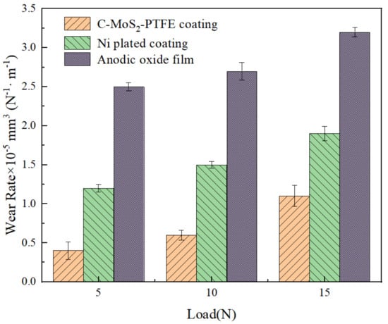 The wear rates of C-MoS2-PTFE coating, 4032 aluminum alloy anodized film, and Ni-plated coating were calculated by Equation (1), and the results are shown in Figure 5. The wear rate of C-MoS2-PTFE coating is much lower than that of 4032 aluminum alloy anodic oxide film and Ni-plated coating. The average wear rates of C-MoS2-PTFE coatings under different loads are 0.4 × 10−5 mm3 N−1 m−1, 0.6 × 10−5 mm3 N−1 m−1, and 1.1 × 10−5 mm3 N−1 m−1, respectively.