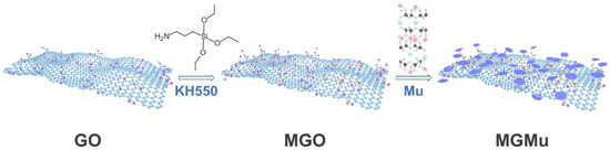 The synthesis process of MGMu is shown in Figure 1. Firstly, 5.33 g GO with 3 wt.% was added to 350 mL water in ultrasonication by stirring for 2 h and stirred for 3 h at room temperature to form GO suspension. Then, 15 mL silane coupling agent (KH550) was added drop by drop to the above-mentioned GO suspension. After being stirred for 1 h at room temperature, the suspension was continuously stirred for 2 h with a water bath at 80 °C. Finally, a wet sample of the modified graphene oxide (MGO) was prepared by centrifugal washing with water.