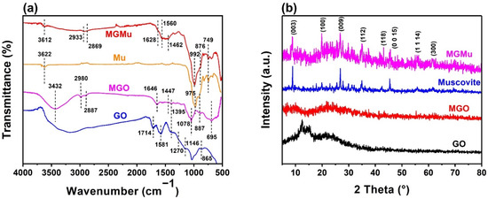 (a) FTIR spectra and (b) XRD patterns of GO, MGO, Mu and MGMu.