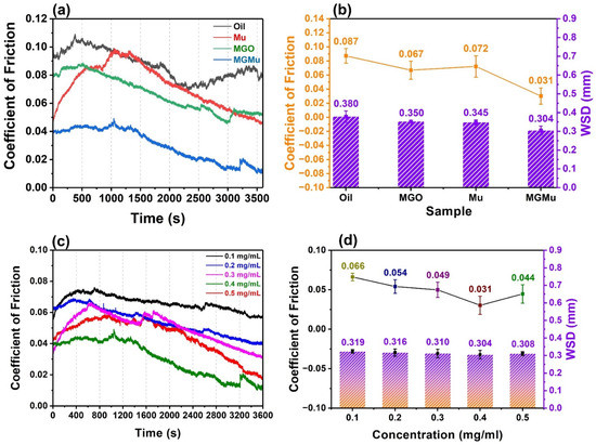 Tribological results of base oil, MGO, Mu, MGMu oil samples: (a) Relationship between friction coefficient and time; (b) Average friction coefficient and average wear scar diameter (WSD). Tribological results of MGMu oil samples with different concentrations: (c) Relationship between friction coefficient and time; (d) Average friction coefficient and average wear scar diameter.