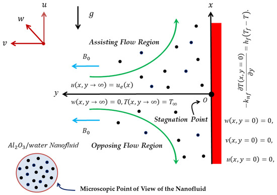 The magneto-mixed convective Williamson fluid flow via a stagnation point stimulated by nanoparticles via a vertical flat plate with thermal radiation and Hall current effects is considered. The convective boundary condition is also examined. The problem of nanofluid flow is schematically shown in Figure 1, where the positive and coordinates deliberate along and normal to the flat plate in the trend of motion and toward the fluid, respectively, while the axis coordinate is transverse to the plane. There is a significant external magnetic impact in the corresponding direction. Due to the exceedingly low persuasive Reynolds number, the induced magnetic influence is also disregarded. The Hall impact cannot be disregarded because the strength of electron–atom collisions is assumed to be quite strong [49]. The flow becomes three-dimensional as the Hall current becomes stronger in the respective direction, causing a crossflow in that direction. To get around this issue, we presupposed that flow amounts in the direction had not changed. The flat plate must have infinite lengths in that direction for this to be true. It is also believed that the plate is electrically non-conducting and that is applied uniformly across the flow according to the generalized Ohms’ law [50]. The governing equations for controlling the flow, along with Boussinesq approximations, are provided as per these presumptions [35,37].