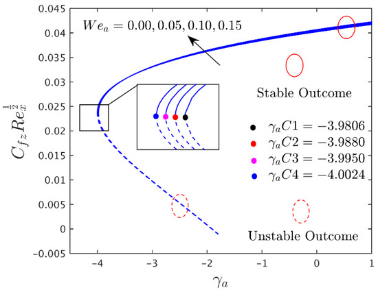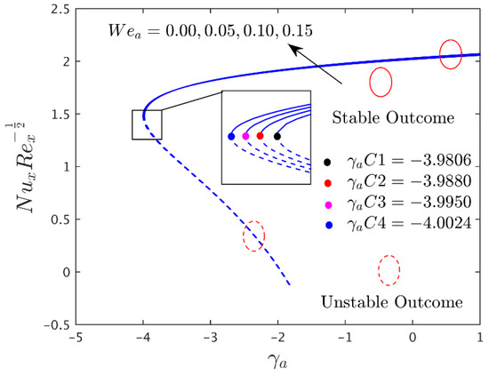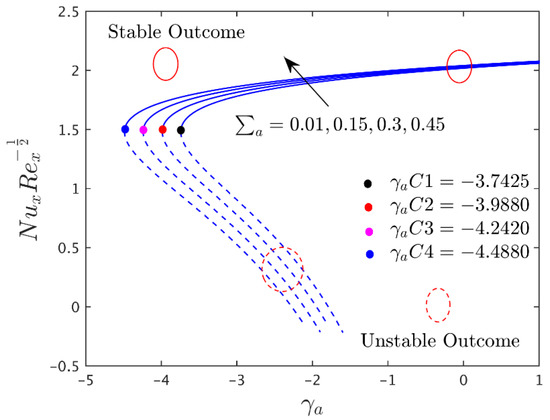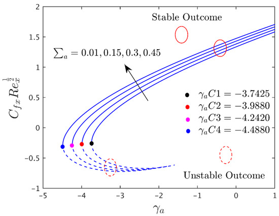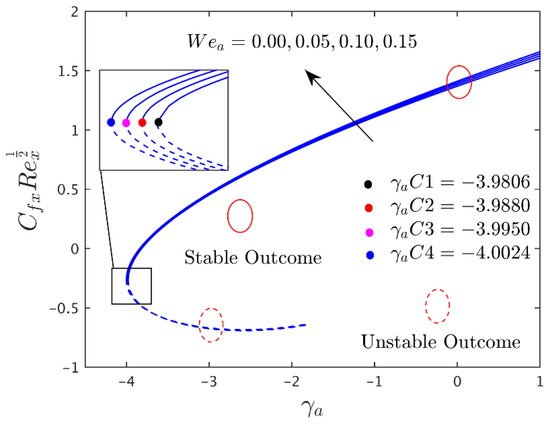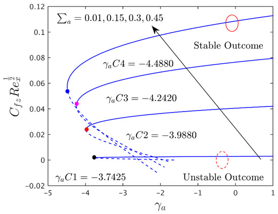 To observe the impressions of different prominent constraints on the shear stress in the axial and transverse directions, the heat transfer and the streamline profiles of the alumina (Al2O3/water) nanoparticles for the unstable and stable branches of outcome are graphically presented in Figure 2, Figure 3, Figure 4, Figure 5, Figure 6, Figure 7, Figure 8, Figure 9, Figure 10, Figure 11, Figure 12, Figure 13 and Figure 14, and also in Table 4, Table 5 and Table 6, respectively. The given problem simulations were performed by varying one parameter at a time and fixing the rest of the comprised parameters. The default values of the fixed embraced parameters are the following: , , , , , and . In the whole study, the stable and unstable solutions are signified by the solid blue and dashed lines, respectively. Meanwhile, the small, solid black, red, pink, and blue balls symbolize the critical or bifurcation point, where the two solutions converge to one location.