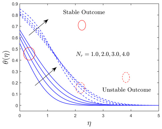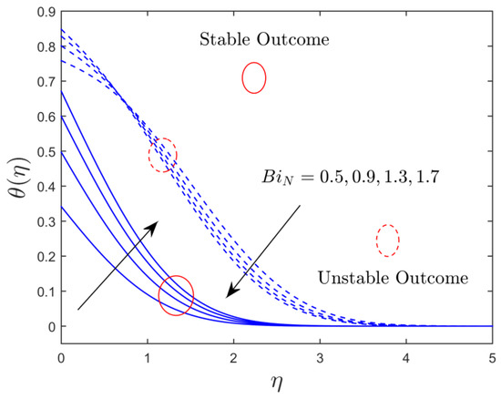 The thermal radiation and convective parameter influences on the temperature distribution for both solution branches are illustrated in Figure 8 and Figure 9, respectively. Figure 8 discloses that the temperature distribution uplifts with growing values of in both solutions. This is because higher impressions of radiation indicate the supremacy of conduction and improve the thermal conductivity of the alumina nanoparticles, resulting in a rise in the thickness of the TBL, as well as an increase in the profile of temperature. Figure 9 discloses that the augmentation in the amount of comes with the stronger convective-type heating at the wall surface of the plate, which increases the temperature slope at the flat plate for the upper branch, and a slight transformation behavior is seen for the branch of the unstable solution. The thermal efficiency can now dive deeper into the static fluid. As a result, as increases, so does the temperature and thickness of the TBL. It is worth noting that, by using reasonably large influences of the convective restriction, the uniform wall temperature can be recovered. Furthermore, pertains to the insulated sheet case.