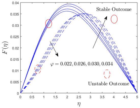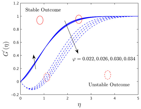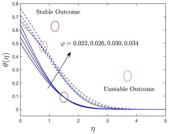Figure 10, Figure 11 and Figure 12 display the impression of the solid nanoparticle volume fraction on the axial and transverse velocity profiles and the dimensionless temperature distribution profiles for the stable and unstable solution branches, respectively. Outcomes indicate that the axial velocity portrays an intensifying tendency for the upper branch solutions initially and then starts to decline continuously for both branches due to the augmentation in the values of the solid nanoparticle volume fraction. On the other hand, the transverse velocity profile curves are amplified for the branch of upper solutions due to the larger impacts of the nanoparticle volume fraction, while it is reduced for the branch of lower solutions owing to the superior impact of nanoparticles. In addition, the temperature profiles enlarged for both solution branches, with larger impacts of the solid nanoparticles’ volume fraction. Physically, it is worth mentioning that, due to the increasing impacts of the nanoparticles’ volume fraction, the thermal conductivity rises as a result, which produces a high improvement in the thermal boundary layer, as well as the temperature profiles.