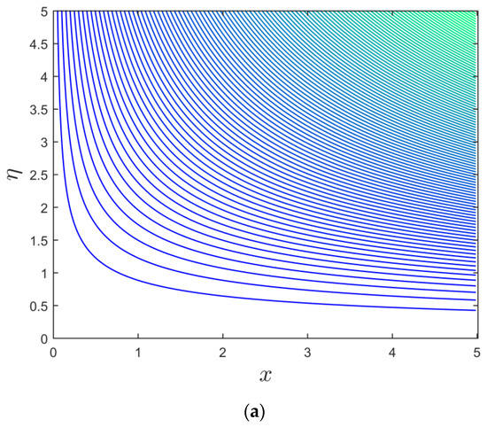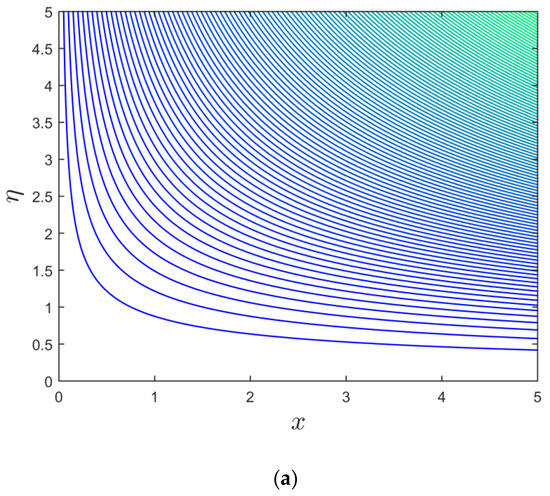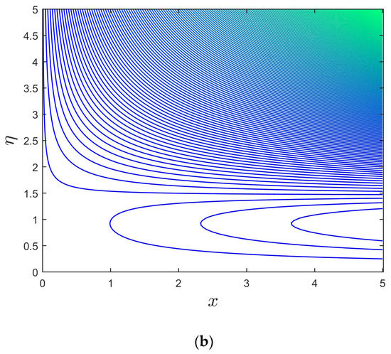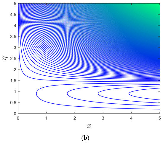 Figure 2, Figure 3 and Figure 4 illustrate the disparity of the magnetic parameter () versus buoyancy parameter on axial shear stress, transverse shear stress, and rate of heat transfer of the alumina (Al2O3/water) nanoparticles, respectively. Figure 2 and Figure 3 display that the axial and transverse shear stresses upsurge with increasing for the branch of stable solutions. For the branch of unstable solutions, however, the behavior of the results is the same in the directions of transverse shear stress and inverted in the axial shear stress. Physically, there is a drag-type force known as a Lorentz force that tends to impede the velocity of the flow, and, consequently, the thicknesses of the velocity boundary layer become depressed. Consequently, the velocity profiles behave inversely to the coefficient of shear stresses. Hence, the shear stress escalates due to the larger consequences of . As illustrated in Figure 4, the heat transmission decreases with for the branch of stable solutions, but it increases with for the branch of unstable solutions. Since there is a large resistance to the motion of fluid due to the Lorentz force, which in turn produces the heat, as an artefact, the thickness or width of the thermal boundary layer, as well as the Nusselt number profiles, increases. Further, the temperature of fluid disappears from the flat plate at some large distance. This is not surprising, since there is a magnetic field that exerts retarding force on the free convection flow. Several physical properties of such fluids can be adjusted by varying the magnetic field. The obtained solutions undoubtedly demonstrate that the flow and the characteristics of heat transfer can be controlled using the magnetic field. Moreover, the changing critical values are obtained for each selected default values of (see Figure 2, Figure 3 and Figure 4). With growing values of , the critical or bifurcation value elevates magnitude-wise. As a result, this pattern suggests that the flow separation decreases as the magnetic parameter’s effects increase. Moreover, for negative values of , there exists a critical value , with dual solutions for : a saddle node bifurcation at , and no outcome for . The separation of the boundary layer occurs at ; therefore, it is not possible to obtain the solution beyond this amount.