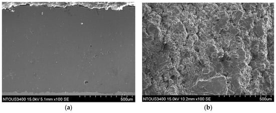 The SEM cross sectional and surface morphology images of spray coating are shown in Figure 2. Figure 2a shows that there are no obvious cracks at the interface between the coating and the substrate, but many microvoids are formed inside the coating. This is because under the condition of low arc spraying power, the melting of aluminum particles is insufficient, resulting in a loose structure between semiliquid aluminum metals, and when some aluminum particles have a thermal softening temperature close to the melting temperature, it is easy to form aluminum droplets. During the solidification process, due to the release of thermal stress, it is easy to form microcracks near the voids []. In Figure 2b, the surface of the spray coating is uneven, and some voids are found. This can be attributed to the accumulation of molten or semimolten metal particles on each other during thermal spraying.