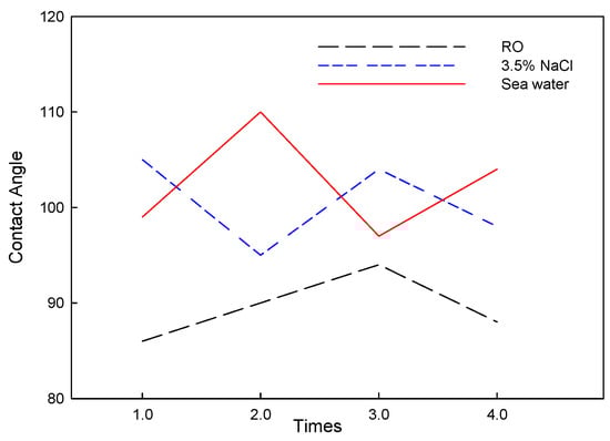 Contact angle test results of the arc thermal spray Al coating in RO water, 3.5 wt% NaCl solution, and seawater.