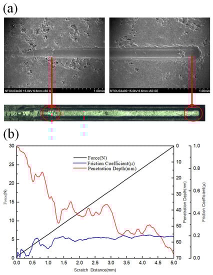 Scratch test of the arc thermal spray Al coating: (a) SEM morphology; (b) scratch profiles.