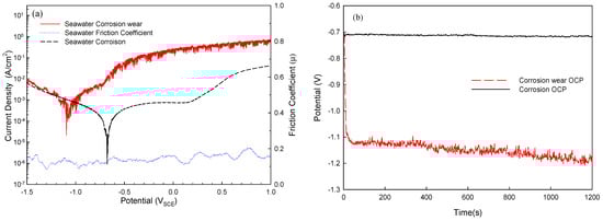 Electrochemical test results: (a) polarization of corrosion and corrosion–wear condition in seawater; (b) the corrosion and corrosion–wear condition in seawater at −713 mVSCE (OCP).
