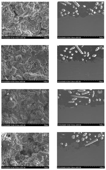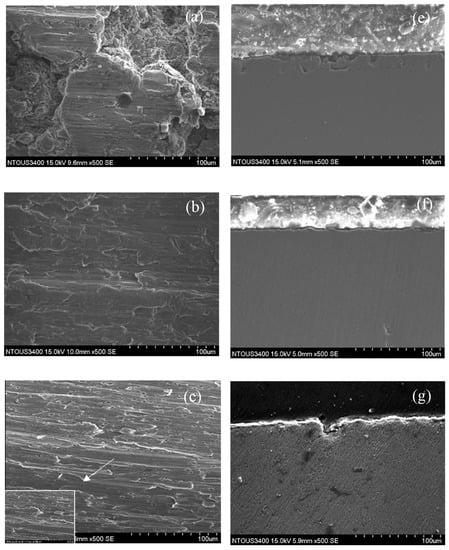 As shown in Figure 7a, the spray Al coating was smooth but was not destroyed in the dip area when the coating was conducted in the corrosion–wear of the Al coating test in the seawater under a load of 3.92 N. However, the coating was destroyed but smooth when conducted in −600 mVSCE, as shown in Figure 7b. The coating was completely destroyed, and many voids formed when conducted in −200 mVSCE, as shown in Figure 7c. The voids on the coating continuously grew and worsened in the applied potential of +100 mVSCE, as shown in Figure 7d. From the cross-section result, some area under load was smooth, while other areas were still rugged under −713 mVSCE, as shown in Figure 7e. The coating was smooth, although it continued wearing in the −600 mVSCE, as shown in Figure 7f. The coating roughness increased, and more voids and cracks formed, caused by the corrosion–wear of Al coating while conducting in −200 mVSCE and +100 mVSCE, as shown in Figure 7g,h.