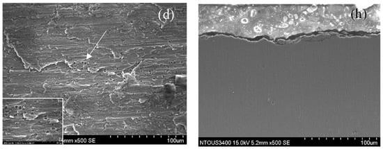 SEM surface morphology of coating after corrosion–wear of the Al coating test in seawater: (a) −713 mVSCE, (b) −600 mVSCE, (c) −200 mVSCE, (d) +100 mVSCE and cross section, (e) −713 mVSCE, (f) −600 mVSCE, (g) −200 mVSCE, and (h) +100 mVSCE.