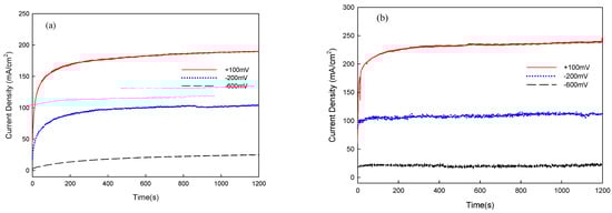 Chronoamperometric curves: (a) corrosion of Al coating in different potential; (b) corrosion–wear of Al coating in different potential.