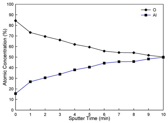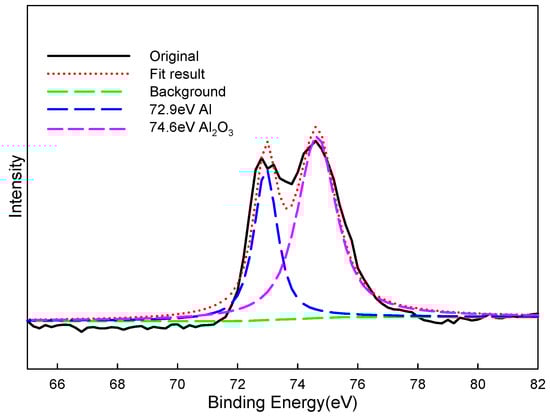 In the depth analysis of the coating by using XPS, Ar+ ablation is usually adopted for etching. In this study, the operated voltage for Ar+ was 2 kV, and the scanning range was 2 × 2 mm. This parameter setting corresponds to an etching rate of 11.38 nm/min on silicon dioxide (SiO2). The element analysis of the Al thermal spray coating corroded at seawater included Al and O, and the results are shown in Figure 9. Using XPS Peak Version 4.0 software (ULVAC-PHI, Co., Ltd., Tokyo, Japan) along with the combination of the NIST (National Institute of Standards and Technology) database and the recent literature with the background subtraction method, Table 5 presents the peak maps of the Al element and alumina, and their associated fitting results. The deconvolution curve fitting results on the binding energy peaks of the Al element and alumina in the measured XPS spectra of the thermal spray Al coating corroded at seawater is shown in Figure 10. The binding energy at 72.9 and 74.6 eV indicates the Al element and alumina in the coatings, respectively, and agreement with the binding energy in the past study [].