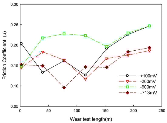 Friction coefficient of the corrosion–wear of the Al coating test under different potentials.