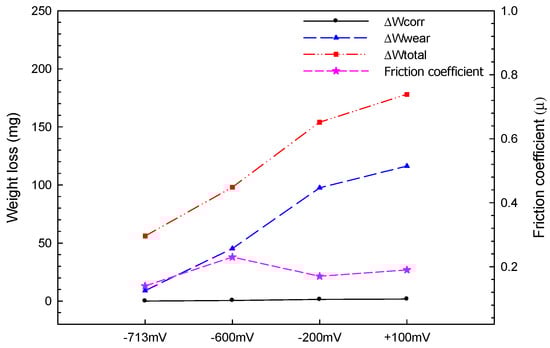 The weight loss of the coating can be used to describe the corrosion of Al coating and corrosion–wear of Al coating interaction: corrosion of Al coating and corrosion–wear of Al coating loss can be the sum of the corrosion of Al coating and corrosion–wear of Al coating results. Wtotal = Wwear + Wcorr + ∆W, where ∆W includes Wwear + Wcorr. By block-on-ring corrosion–wear of Al coating quantitative analysis, ∆Wcorr can be calculated. ∆Wwear = (M/nF) × ∆icorr × S × t, where M is the Al atomic weight of 26.98 g/mole, the corrosion current density is ∆icorr= icorr − ipure-corr (mA/cm2, as shown in Table 3 and Table 4), S is the tested area, and t is the test time of 1200 s, as shown in Table 6. Figure 12 illustrates the weight loss and friction coefficient under different polarization potentials [,,,].