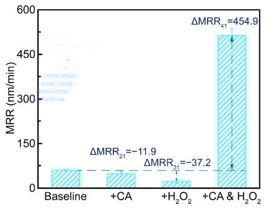 3.2. Synergistic Effect of Citric Acid and H2O2 on the CMP of 18CrNiMo7-6 Steel