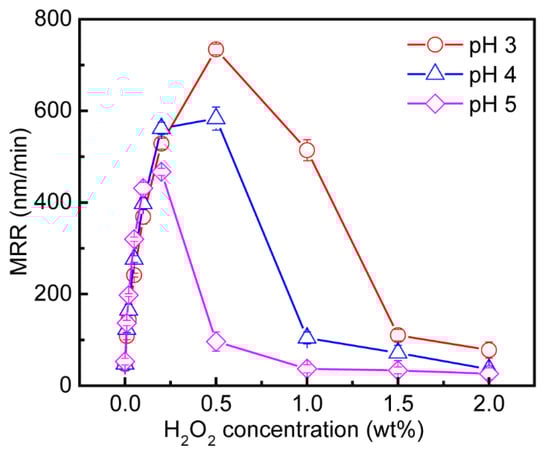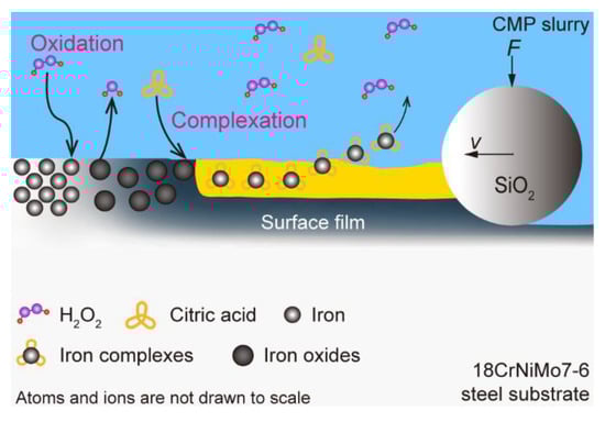 - During CMP, iron was first oxidized to Fe2+ and Fe3+ by H2O2. Then, the citric acid reacted with Fe2+ and Fe3+ on the surface to form complexes such as FeHCit and FeCit. Between the two consecutive mechanical abrasions, the complexes may not have dissolved in the slurry in time, and much may have remained on the surface preventing further corrosion, thereby leading to a surface roughness that was low. However, the surface integrity may have been weakened by the complexes and, therefore, the MRR was high.