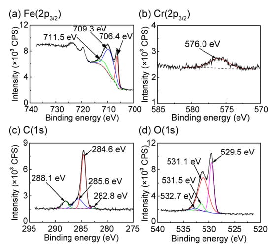 - Keller, P.; Strehblow, H.-H. XPS investigations of electrochemically formed passive layers on Fe/Cr-alloys in 0.5 M H2SO4. Corros. Sci. 2004, 46, 1939–1952. [Google Scholar] [CrossRef]