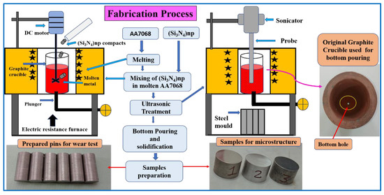 Fabrication of nanocomposites was conducted by novel bottom pouring advanced ultrasonic-assisted stir casting (USC) process; the schematic representation of casting setup is shown in Figure 2. Initially, the mixture of AA7068 powder (approx. 50 µm) and Si3N4 nano-powder (avg. diameter 174.36 nm) in a ratio of 1:3 was ball milled for 2 h at 450 rpm. Isopropyl alcohol was used to prevent overheating of milling jars. Prepared milled powder was compacted at room temperature by applying 450 MPa pressure and ready to use in casting. Later, 1 kg of high-strength 7068 alloys was melted at 780 °C, then 1 wt.% coverall was mixed to make slag and impurities free melt. Preheating of permanent mold and compacted milled powder was performed at 450 °C to remove the moisture content. The preheated compacted powder capsules were mixed in molten alloy through mechanical stirring at 500 rpm for 10 min. Ultrasonic waves (2 kHz) were transferred into the slurry for 5 min to break the powder cluster with the help of a 20 mm niobium probe. The processed slurry was bottom-poured in the preheated steel mold with the continuation of the stirring process. As per ASTM guidelines, specimens for hardness, microstructure, and wear tests were prepared after solidification.
