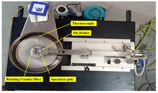 FESEM was used to analyze the microstructure of specimens, and EDS characterization was carried out at 15 kV accelerating voltage, 4.8 mm working distance using NOVA SEM 450 (IIT Kanpur). Microhardness was measured using an FH-11 series universal hardness tester at the application of 5 N force for 10 s at ambient temperature; the average of ten readings was used for the analysis. Wear tests were performed on a rotary tribometer (DUCOM, Bengaluru, India), shown in Figure 3. For the wear test, cylindrical specimens of 10 mm diameter and 30 mm height were prepared and well-polished to ensure flatness. To determine the weight measurement, the ultrasonic cleaner was used to clean the sample before and after the wear test. An EN-31 steel counter disc (60 mm × 10 mm) with the hardness of 65 HRC was used against composite pins. EN-31steel contained C (0.95–1.2%), Cr (1.2–1.6%), Mn (0.4–0.7%), Si (0.1–0.35%), P (0.04 max), and S (0.05 max). A digital weighing balance (Wensar ISO 9001:2015) with a precision sensitivity of 0.01mg was used for the weight measurement. All the sliding wear tests were performed under dry conditions with varying controlling parameters. Damage surfaces were investigated with SEM (scanning electron microscope).