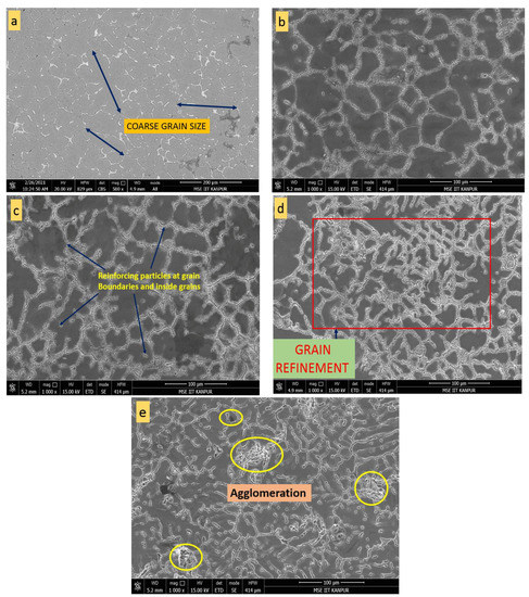 FESEM images of 7068 alloy and its nanocomposites: (a) pure alloy; (b) with 0.5 wt.% Si3N4; (c) with 1.0 wt.% Si3N4; (d) with 1.5 wt.% Si3N4; (e) with 2.0 wt.% Si3N4.