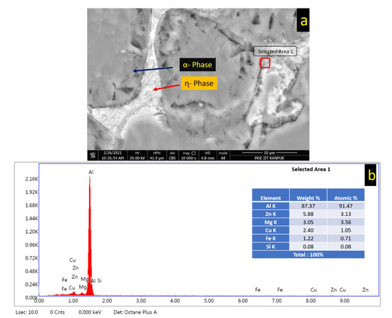 (a) Microstructure of AA7068 alloy; (b) EDS spectrum of A7068 alloy.