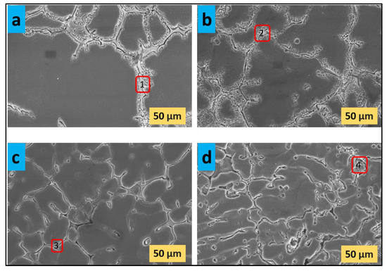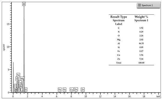 Figure 5 represents the SEM image of the as-cast 7068 aluminum alloy, α-Al, and η-MgZn2 eutectic phase observed in micrographs. EDS confirmed the existence of the intermetallic MgZn2 phase, which reveals that the Zn and Mg contents are more prominent than other alloying elements. Table 5 shows the EDS quantification of nanocomposites containing 0.5, 1, 1.5, and 2 wt.% Si3N4. The location (marked as 1, 2, 3, and 4) where EDS was carried out is shown in Figure 6. The EDS spectrum confirmed the presence of Si and N with increasing content from 0.5 to 2 wt.% Si3N4 nanocomposites.