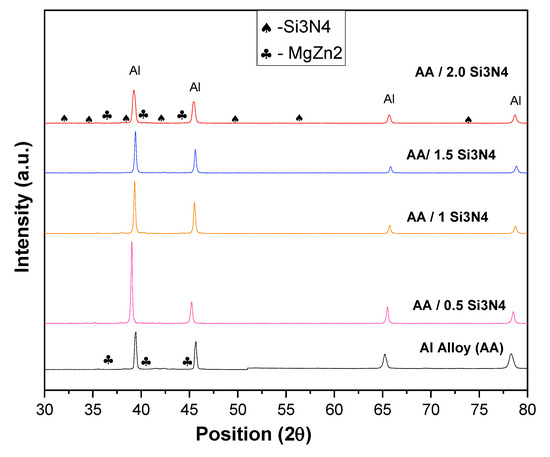 XRD analysis of AA7068 and nanocomposites (from 0.5–2.0 wt.% Si3N4) is shown in Figure 7. Al and MgZn2 phases were observed in AA7068, whereas Al, Si3N4, and MgZn2 phases were noticed in nanocomposites. For AA7068 alloy, peaks have been obtained in the 2θ span ranging from 20 to 80, and the peaks at 2θ of 39.45°, 45.67°, 65.88°, and 79.76° belong to pure Al, and the peaks at 2θ of 37.31°, 40.98°, and 44.67° belong to MgZn2, and the other remaining minor peaks are attributed to impurity. Similarly, for 2 wt.% nanocomposites, the peaks at 2θ of 39.02°, 45.21°, 65.50°, and 78.52° belong to pure Al, and the peaks at 2θ of 37.25°, 41.08°, and 44.35° belong to MgZn2, and the peaks 2θ of 32.39°, 35.83°, 37.39°, 42.46°, 50.76°, 56.81°, and 74.61° belong to Si3N4. It is noticed that the peaks of Al are clearly shown at near 2θ angle of 39°, 45°, 65°, 79°, and the peak of MgZn2 is observed near 2θ angle of 32°, 35°, and 37°.