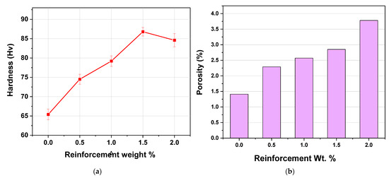 (a) Hardness of alloy and nanocomposites; (b) porosity content (%) of alloy and nanocomposites.