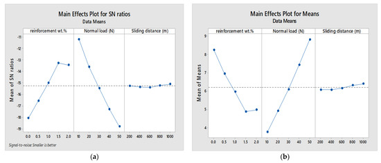 Figure 9a,b represents the MEP (main effect plot) for experimental controlling factors on wear loss. Figure 9a depicts the impact of observed experimental factors (reinforcement wt.%, normal load, and sliding speed) on wear rate. The SNR mean values deviated from the horizontal line for average load and formed a steeper connected line that significantly impacted the wear loss. The slope of the SNR means sharply decreases at 2 wt.% and confirms the increment in wear loss compared to 1.5 wt.% due to higher agglomeration of reinforcing particles. The values of the SNR means are much closer to the horizontal line in the case of sliding speed, indicating the least influencing factor.