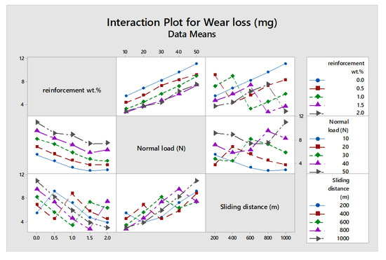 It is forecasted that the deviation in the experimental wear loss values is a function of all considered controlling variables within the range measured in the present work. Figure 10 shows the interaction plot of wear loss for all controlling factors. Referring to Figure 10, wear loss lines concerning all parameters are non-parallel. These lines indicated the interaction between control factors. The decrement in wear loss was noticed with increasing reinforcement percent up to 1.5%; after it increases, this might be credited to severe clustering/agglomeration of nanoparticles. Wear loss line for 2% is intersecting with others. By analyzing the other lines in the interaction plot, it can be concluded that the applied load has minimum interaction. The weight % and sliding distance have higher interaction than normal load; as the interaction is higher, its influence on wear loss is lower. Parveen A et al. [37] performed a dry rubbing wear test on Al/Si3N4 composites with various loads (20 N, 30 N, and 40 N) and sliding distances (1 km, 2 km, and 3 km). They investigated that load is the primary parameter affecting wear rate as the normal force increases the wear rate. Miloradović N et al. [38] conducted research on wear performance on ZA27/SiC/Gr composites and optimized, by the Taguchi model, different loads (10 N, 20 N, and 30 N) and sliding velocities (0.25 m/s, 0.5 m/s, and 1 m/s) that were chosen for the wear test. They observed that load has a dominant impact on wear.