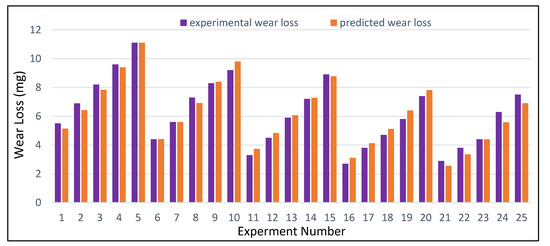 Consequently, versus fits curve/scatter plots, where residuals are on the vertical axis and expected data are on the horizontal axis, explain the non-linearity, unlike error variance. From the normal probability graph, maximum data are fitted near or on the line that explains the accuracy of the predicted value calculated by Equation (3). In addition, the x- and y-axes are approximately symmetrical, showing that obtained results are significantly modeled and accurate. The unevenness of factors in all residual graphs is uniform over the range of formulated values. From the above discussion, it can be concluded that the current regression model is the best fit to explicate the present study’s observed data. The comparison between actual and formulated wear loss for each experiment displayed in Table 4 is shown in Figure 11.