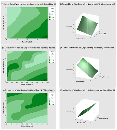 Contour plots are two-dimensional representations, where the third z-axis is constant and named as a contour while the x- and y-axes are visible. Surface plots are three-dimensional layouts where all three axes are visible. This study draws contour and surface plots to understand the expected link between three process variables. Figure 13a–f shows the contour and surface graphs of wear loss versus process variables (reinforcement wt.%, normal load, and sliding distance); all the plots are drawn by considering two control factors. The dark green area in contour plots depicts the significant wear loss. A conversion from light green to dark green directly expresses the wear loss from low to high. From Figure 13a,b, higher wear loss can be seen at a higher load (40 N, 50 N) and low concentration, with minimum wear obtained at 1.5 wt.% and an increase again at 2 wt.%. Figure 13c,d explains that the wear increases with sliding distance, but for low concentrations (0 and 0.5), as the second phase increases in the matrix, wear loss is not much enhanced with sliding distance. As per the study of sliding wear of AA7075/SiC composites at different sliding distances, a more significant wear rate was found for alloy and decreased with increasing concentration of SiC (0.5 to 2 wt.%) [1]. Figure 13e,f shows low wear loss found at low load and less distance, but it enhances when the load increases from 10 N to 50 N. Kumar GBV et al. [35] noticed the increased weight loss with an increment in load from 10 N to 60 N in Al 6063/Si3N4 composites. From the contour and surface plot analysis, it can be concluded that load is the major parameter that influences wear loss, followed by wt.% and sliding distance as minor influential factors.