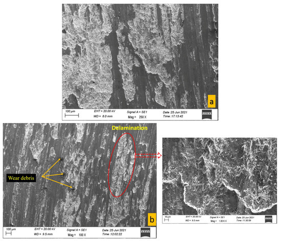Worn surface characterization of composites is more complex than alloys and metals. The SEM study of the worn surface was carried out to examine the dominant wear mechanism in the Al matrix and their nanocomposites at different weight % of Si3N4. The SEM micrographs of AA7068 alloy and nanocomposites at 50 N applied load and 1.047 m/s sliding velocity for a 1000 m sliding distance are shown in Figure 14. Figure 14a represents the worn surface of AA7068, and a severe plastically deformed and delaminated surface was observed. At the beginning of the wear test, the asperities of the specimen pin and counter disc came under contact. The counter surface distorted softer surface asperities during the initial stage of sliding action. Further sliding leads to the formation and breaking of junctions at the interface under high pressure, leading to plastic deformation of a softer surface. The material transfer also starts between interacting surfaces due to the temperature rise by the action of friction.
