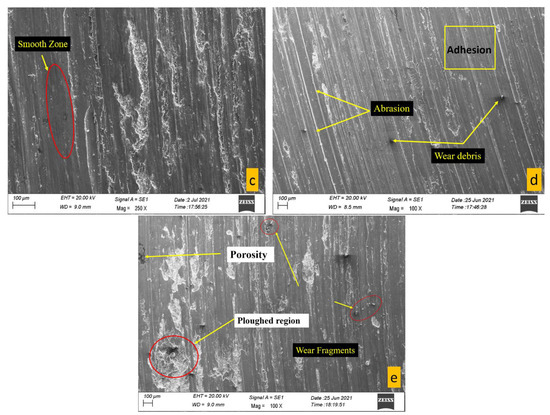 Meanwhile, the worn surface of nanocomposites is smoother than matrix alloy. Finer grooves were observed in micrographs of nanocomposites compared to AA7068 (shown in Figure 14b–e, attributed to the increased wear resistance after the inclusion of hard Si3N4 nanoparticles in AA7068. In addition, Si3N4 is also reactive to the surrounding humidity: it reacts with atmospheric H2O and forms a SiO2 layer between the contacting interface. This oxide layer prevents the direct contact of the specimen with the hard counter disc. It acts as a lubricant, resulting in decreasing the coefficient of friction and increasing wear resistance. Moreover, it is evident from Figure 14d that the grooves are closely packed and much smaller in AA7068/1.5 wt.% Si3N4 nanocomposite due to the sliding action of a large number of hard Si3N4 particles and debris. However, it is observed that the wear loss increased after 1.5 wt.% due to the increased porosity and ununiform distribution of reinforcing particles. Pits and the crumbled region observed in the micrograph of AA7068/2 wt.% Si3N4 nanocomposites (shown in Figure 14e) support increased wear loss due to high void content, casting defects, agglomeration, and material spallation. The cluster of particles improves the wear resistance at lower, medium load, and sliding distances due to the hard nature of Si3N4 particles and tribo-chemical layers (MML) formation between the contacting surfaces, resulting in wear resistance improvement. However, as the load and distance increased, the formed MML deformed due to a rise in temperature, material softening, and material transfer, leading to a decrease in wear resistance. In addition, higher-degree three-body abrasion by wear debris, material spallation, and Archard equation support the increase in wear loss for 2 wt.% nanocomposites.
