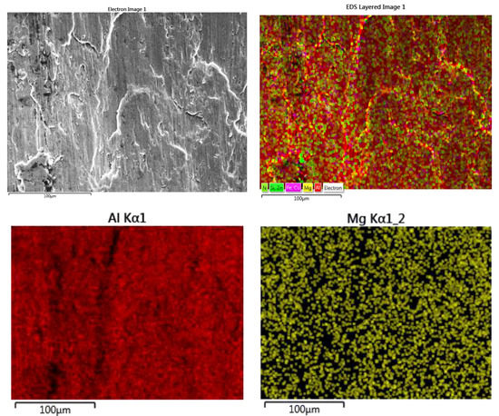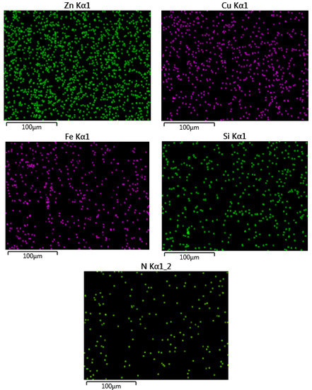 Figure 15 shows the elemental mapping of the worn surface of the nanocomposite, where the presence of major elements in AMNC, such as Al, Zn, Cu, Mg, Si, and N, are confirmed and shown with different colors.