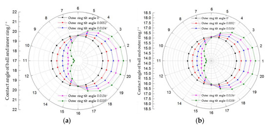 Figure 6, when the inclination angle of the outer ring is zero, the ball-raceway contact angles are approximately constant, presenting a regular circle located in the center of the polar coordinate system, while the polar coordinate circle diagram shifts to the right as a whole, as the outer ring inclination angle increases; the ball-raceway contact angles increase along the radial direction of force applied to the outer ring, whereas the contact angles decrease.