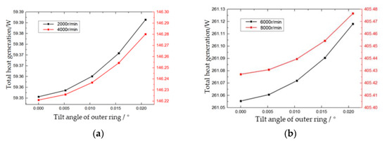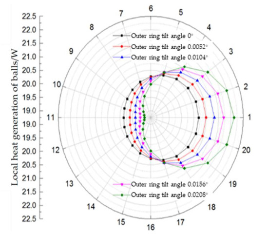Figure 8 that the variation tendency of local heat generation of the ball is consistent with the variation tendency of the contact angles, which means that with the increase in the outer ring tilt angle, the heat generation in the radial direction increases. While the heat generation decreases in the opposite direction of the radial force, in the direction perpendicular to the radial force, it is constant. In addition, the heat generation of the angular contact ball bearing shows a slight increase with the increase in the outer ring tilt. The increment of total heat generation is small with the increase in tilt angle at the same speed and is almost unchanged, which indicates that the inclination of the outer ring has little impact on the total heat generation of the bearing. The total heat generation of the bearing is mainly affected by the rotation speed; as the speed increases gradually from 2000 rpm to 8000 rpm, the heat generation tends to increase progressively by double with each 2000 rpm increase, meanwhile, the increase rate slows down gradually.