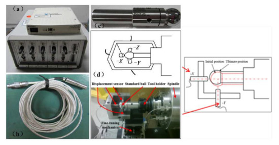 Figure 9, and the three directions indicate the horizontal radial, vertical radial, and axial coordinate directions, with the standard ball center as the coordinate center, which is consistent with the coordinate system setting of the previous theoretical analysis in this paper. The C8-2.0 capacitive displacement transducer is set to the standard measurement range (250), the bandwidth is set to 1 kHz (resolution 1.4 nm), and the sampling frequency is 360 Hz. Before the formal test, the standard ball is clamped to the front end of the spindle by the tool holder, and then the displacement transducer is installed at the corresponding measurement position and adjusted to the center on the standard ball using the fine adjustment mechanism.