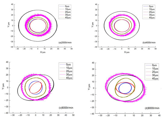 After the spindle rotates and the temperature data reach a stable value, the radial X and Y channel displacement signals are collected and recorded, and the spindle rotation trajectory is plotted at each speed, as shown in