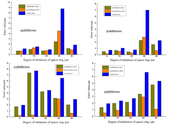 Figure 10, the spindle rotation trajectory is in the best condition when the outer ring is not tilted. When the outer spacer parallelism is poor, the spindle rotary trajectory becomes worse, both in terms of roundness and radial runout. The TIR (total indicated runout) value of the spindle front end in both radial directions increases, the rotary trajectory expands, and the width of the spindle front end runout trajectory becomes larger accordingly, which shows that the outer spacer parallelism error causes uneven heat generation inside the bearing and tilt deformation, and immediately results in an increase in the NRRO (non-repeatable runout) value at the spindle front end. However, it can be observed that the slewing accuracy does not completely increase with the increase in the outer ring unbalance, and the slewing accuracy shows the phenomenon of interval runout. In addition, it can be observed from the above analysis that in the heat generation calculation of different inclinations of the bearing outer ring, the uneven heat generation of the bearing is more obvious as the inclination increases, which shows a certain linear relationship. However, in the experiment of spindle rotation accuracy under different outer ring inclinations, it is found that the rotation accuracy of the spindle is the best when the outer ring is not inclined. However, with the increase in outer ring inclination, the rotation accuracy does not have a similar linear relationship. This is because, for a precision spindle, its rotation accuracy is jointly affected by many factors, such as thermal deformation of the bearing, shaft structure, and modal frequency, etc.