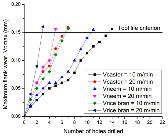 The maximum flank wear versus the number of drilled holes using various types of non-edible vegetable oils such as castor, neem, and rice bran oils is depicted in Figure 3. The progression of the flank wear was measured after each hole for speeds of 10 and 20 m/min with a constant feed of 0.015 mm/rev. As indicated in Figure 3, the tool wear curves within all cutting speeds had reached the tool life criterion when the maximum flank wear crossed 0.15 mm. As is apparent, the castor oil was able to produce a greater number of holes compared to the neem and rice bran oils, regardless of the cutting speeds employed. It can be observed that the number of drilled holes using neem oil and rice bran oil was 21% and 50% lower than that of the castor oil at a cutting speed of 10 m/min, respectively. Meanwhile, at 20 m/min, the number of drilled holes significantly reduced by 29% and 59% using neem oil and rice bran oil, respectively, in comparison to castor oil. This is attributed to the high amount of ricinoleic acid and the high viscosity of castor oil compared to the other two oils [30,31]. It has been reported that a highly viscous oil reduces cutting force, workpiece temperature, and the progression of flank wear [32]. With the thick and strong layer of protective film formed on the workpiece surface by castor oil and its longer carbon chain, this eventually offered high anti-wear, friction, high strength, and durability of the lubricant film [33]. Apart from that, as mentioned by Ozcelik et al. [34], the high amount of saturated fatty acid in castor oil chemically reacts with metal surfaces to form a layer of fatty acid soap adsorption film. Due to the molecular attractions, the fatty acid molecules are deposited into metal surfaces to prevent friction and reduce wear.