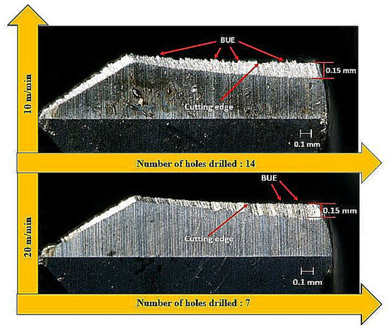 According to Xavior et al. and Khalil et al. [38,39], flank wear found on the cutting tool is the most common wear when machining Inconel 718. Flank wear is attributed to abrasion due to the friction between the clearance face of the cutting tool and the workpiece. This can be easily identified by tiny grooves that run parallel to the cutting direction. Based on this flank wear, the maximum length of the groove is commonly used in industry to determine the end of the effective tool life [40]. Figure 4 illustrates the maximum flank wear, Vbmax, for castor oil after drilling 14 and 7 holes at 10 m/min and 20 m/min, respectively. From Figure 4, it is apparent that the formation of a built-up edge (BUE) occurs at the same locations of the tool wear area. BUE is the adhesion of the workpiece material at the cutting edge of the cutting tool and can be prevented by implementing higher cutting speeds or by using MCFs [41].