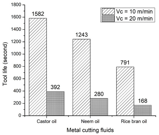 Cutting speed has the greatest impact on tool life. According to many researchers, the tool life reduces with higher cutting speed [42,43]. High cutting speed leads to temperature rises in the cutting zone which accelerates the flank wear and weakens the cutting tool. As a result, premature tool failure, known as cutting tool breakage or catastrophic failure, occurs and the cutting process needs to stop for tool changing. Further, it is noted that longer tool life occurred with a minimum feed rate value. Therefore, the low feed rate value is kept constant within the experiment since the tool life is inversely proportional to cutting speed and feed rate. Overall, the results demonstrated the outstanding performance of castor oil as an MCF in comparison to neem and rice bran oils in achieving the maximum tool life at two cutting speeds. Tool life is highly significant for machinability evaluation and eliminating the time for cutting tool change. When the tool life expires, the reliability of the cutting tool influences the quality of the machined parts and productivity.