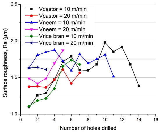 Figure 6 illustrates the graphical results of surface roughness of the drilled holes using castor, neem, and rice bran oils under cutting speeds of 10 and 20 m/min. It can be observed that the surface roughness values during initial drilling for all types of MCFs using the MQL technique were within 1.095 to 1.633 µm. As drilling progresses, further intermittent and inconsistent surface roughness values were recorded in the range of 1.095 to 1.980 µm, until it reached the tool life criteria. As stated by a previous study, MQL achieved lower surface roughness at a lower cost compared to flood lubrication [40]. It is evident that the surface roughness using castor, neem, and rice bran oils recorded a roughness value of less than 2 μm. It should be noted that the overall surface roughness requirement for finished bolt holes in turbine discs is given as Ra < 1.6 μm, and for pre-drilled holes, is Ra < 2 μm in drilling Inconel 718 [44,45].